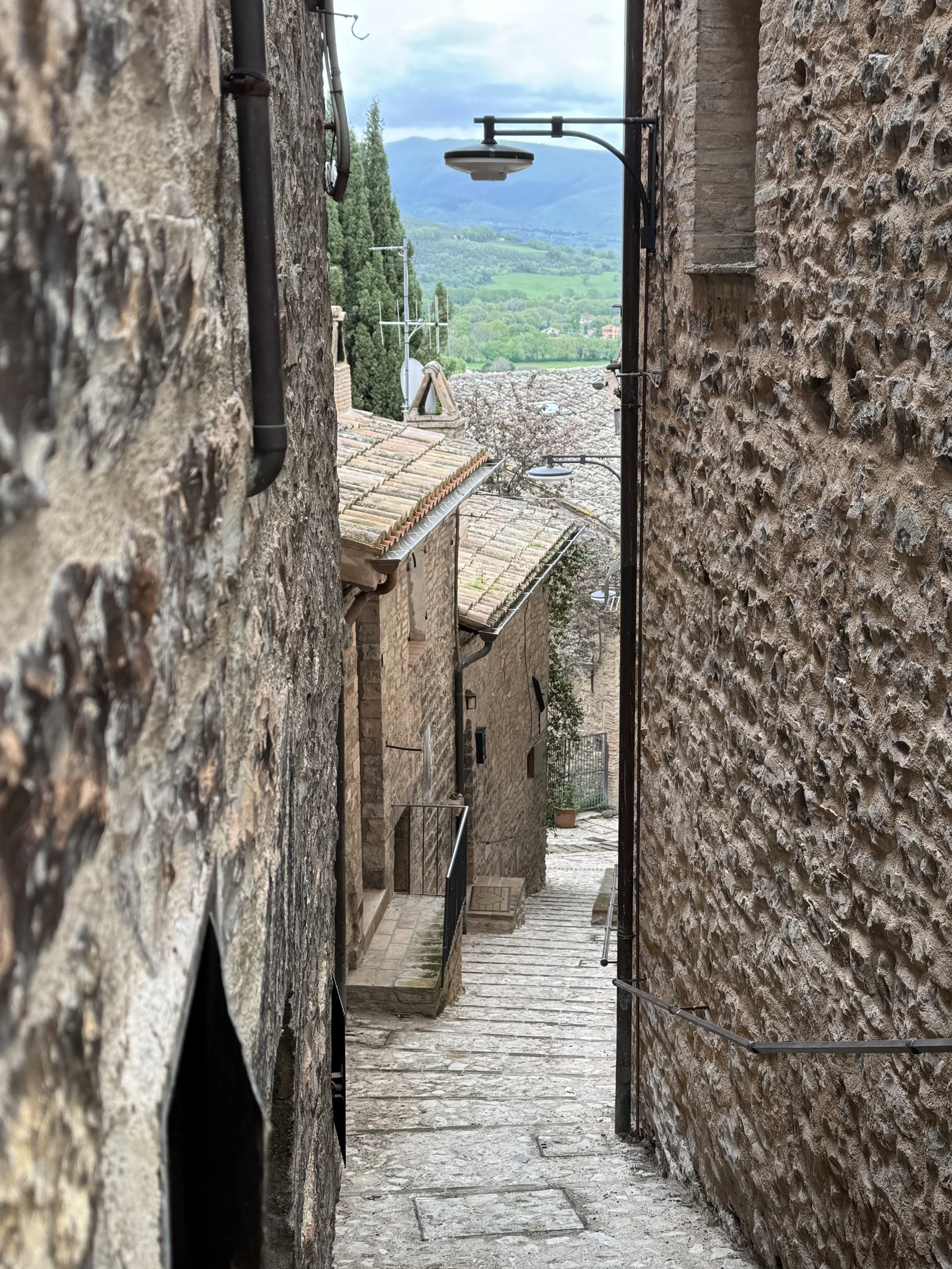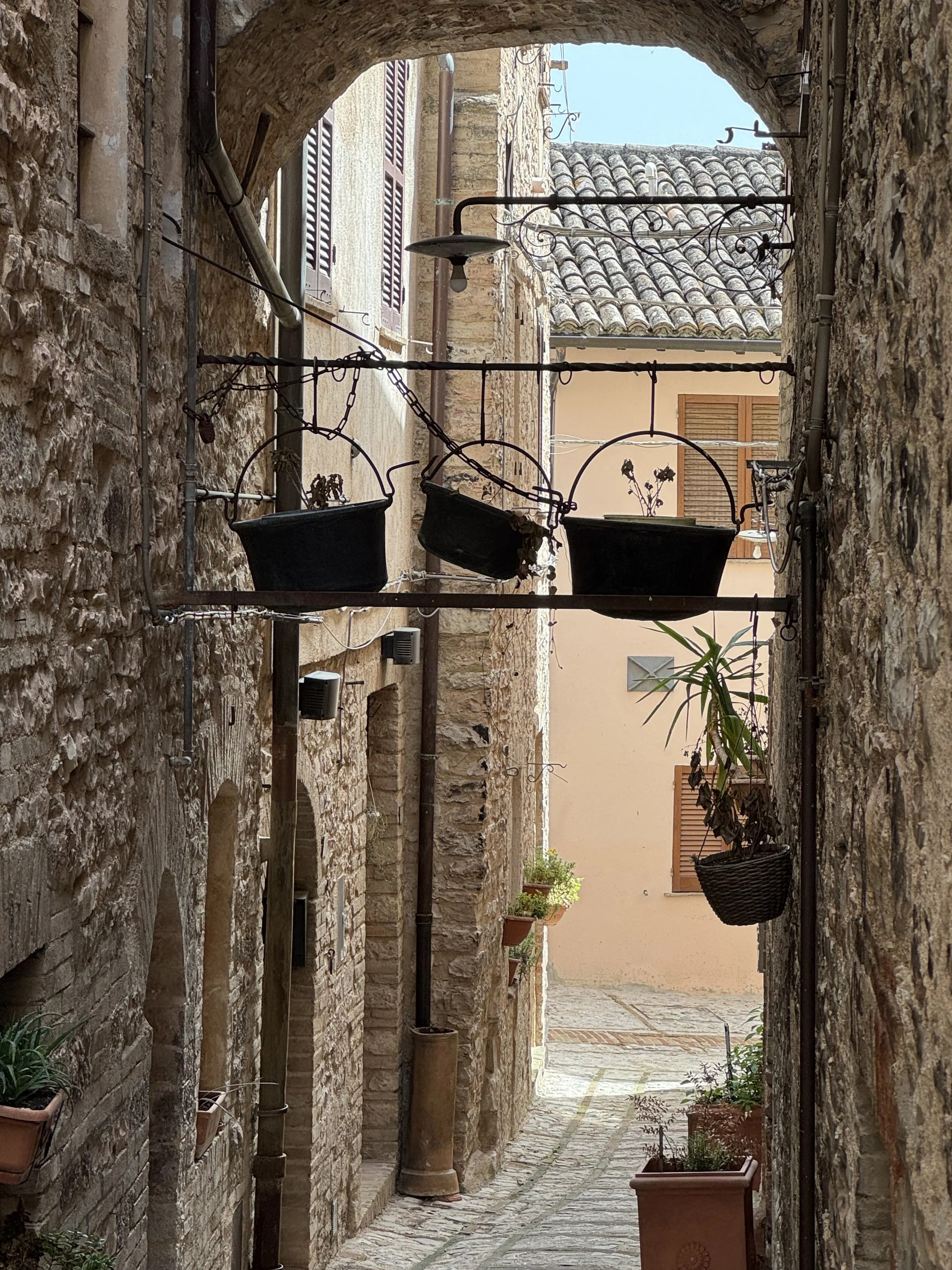 Wandering the steep and winding Medieval streets. Spello is full of twisting alleys, courtyards, and squares. One alley, the Vicolo dei Baci, must see lots of kissing couples. The architecture throughout town is lovely, and everywhere there are flowers.