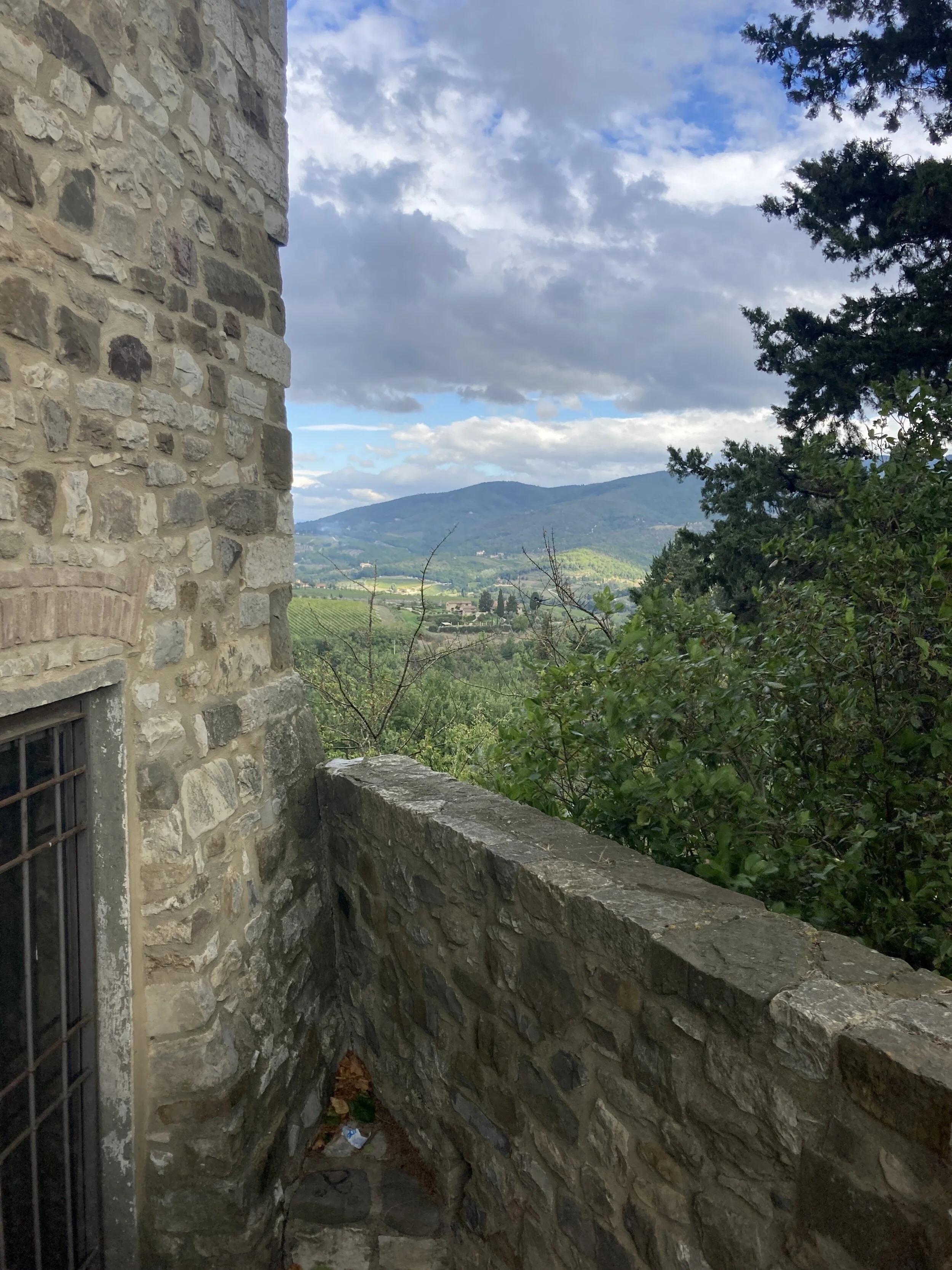 On the edge of town, beyond the streets that wrap around the castle, are far-reaching views of the Chianti countryside. The orderly groves of olive trees and the long rows of grapevines, with just a hint of early fall color, paint a classically Tuscan picture.