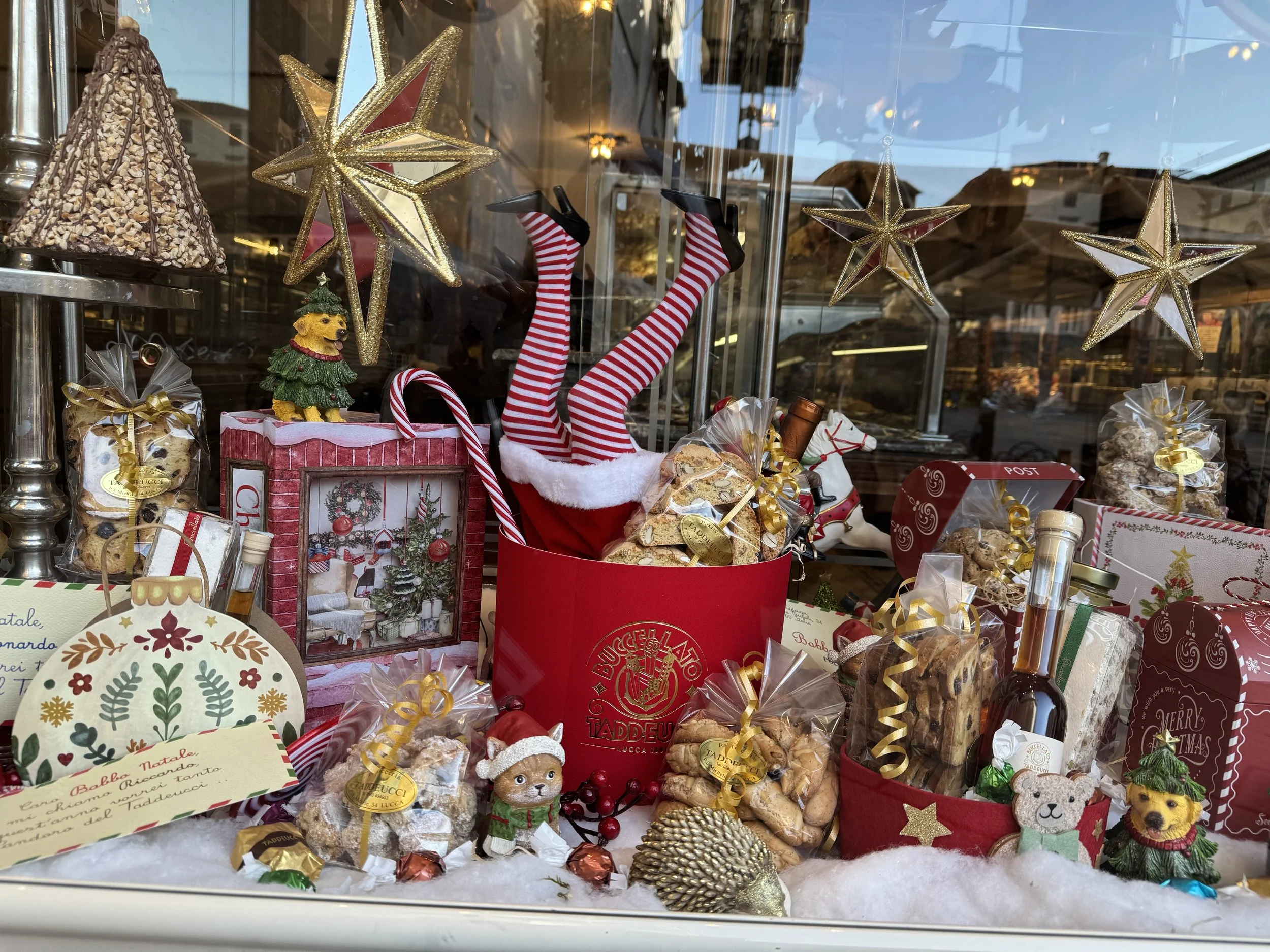 First to appear are the decorated shop windows.. We may not have a big Macy’s display window here in Lucca, but the small shop windows are wonderfully decked out. Walking through town to see the Christmas windows is one of my favorite holiday activities.
