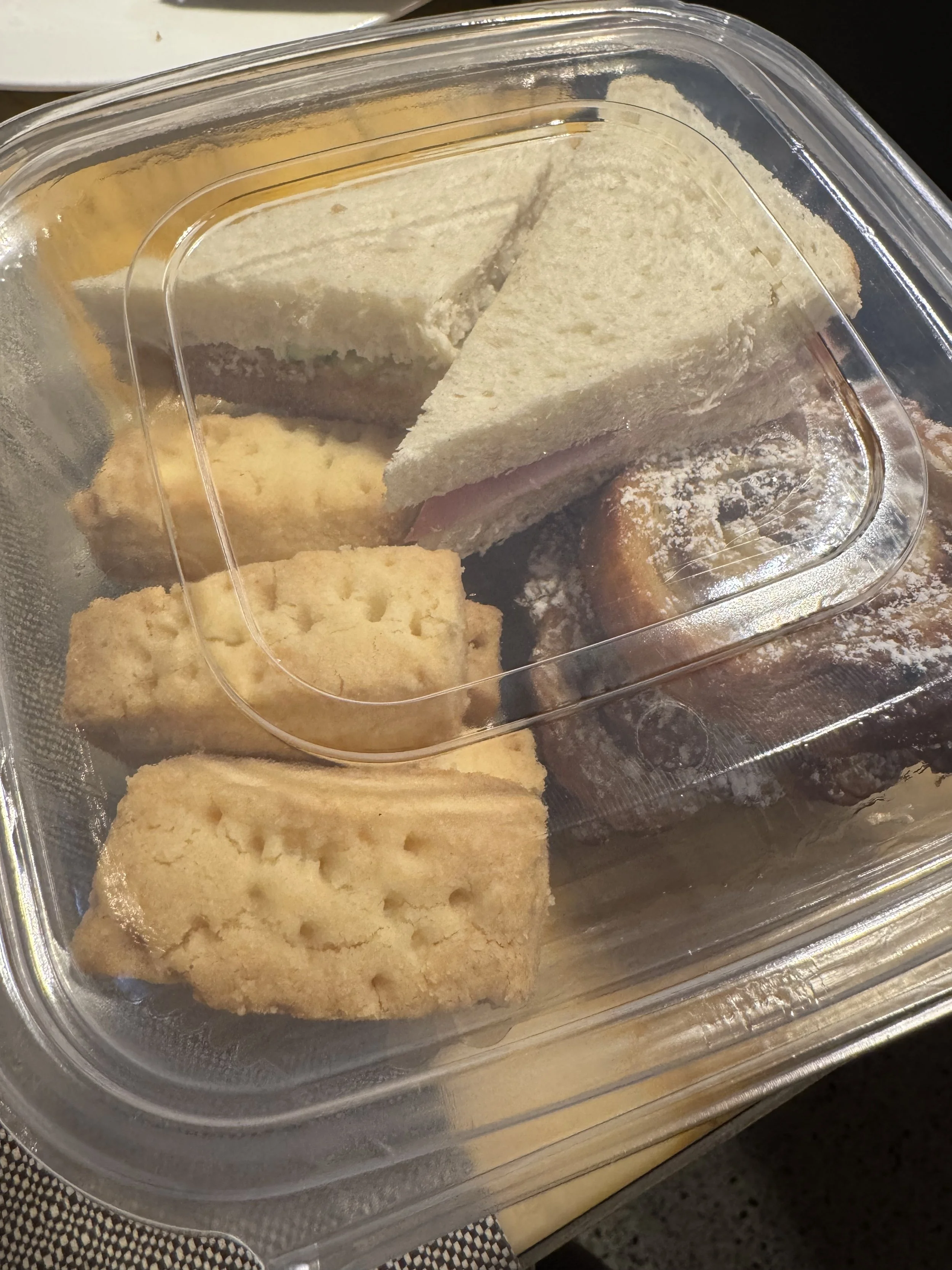 There was a thinly sliced salmon on whole grain bread, one with bacon on a mini whole grain croissant, and an open faced avocado sandwich on a crispy sesame bread. Luckily these were small – but they could have been a lunch all by themselves. The next tier held some small pastries and the bottom tier was desserts.