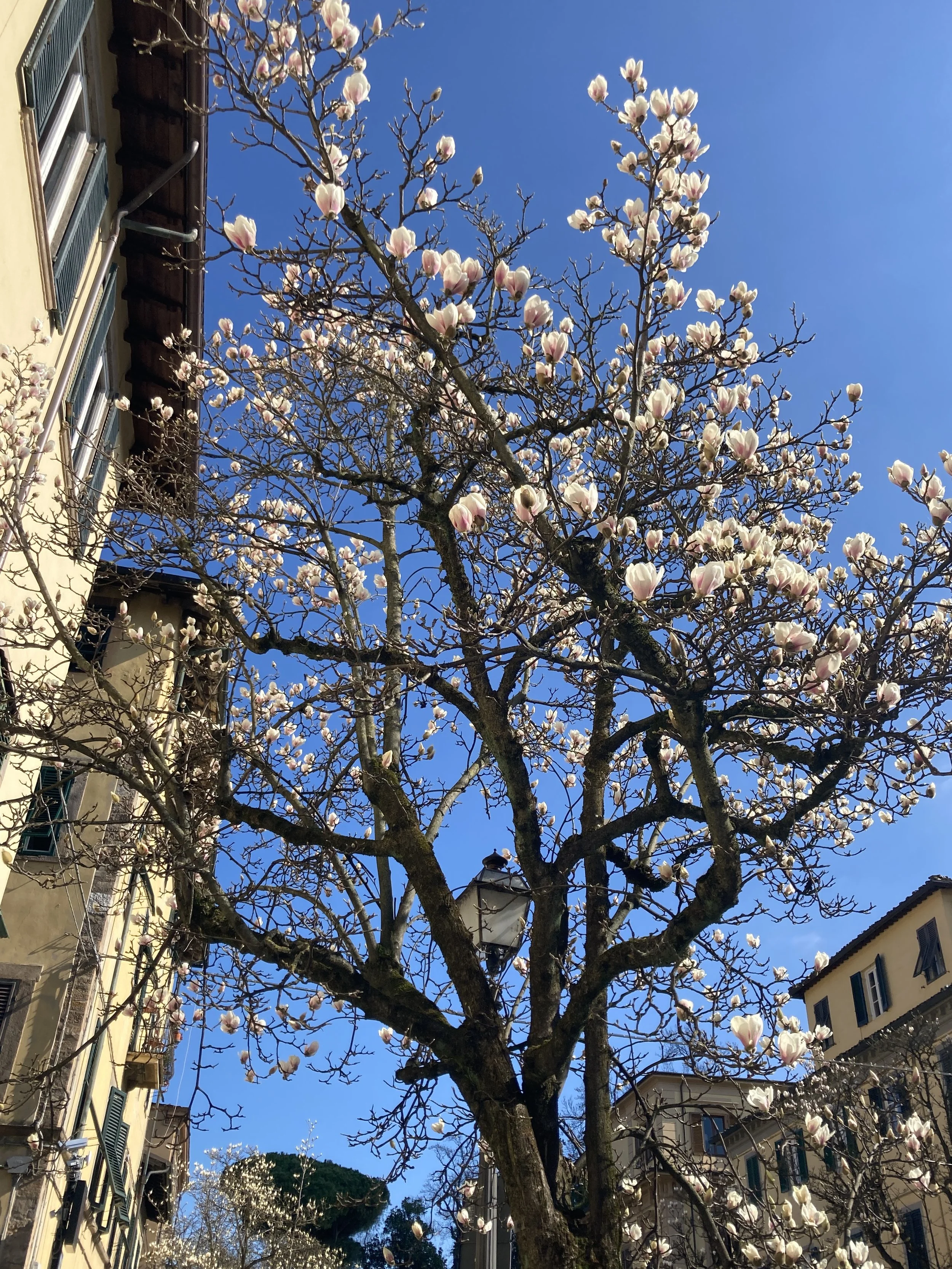 Magnolias in bloom along Corso Garibaldi in Lucca, last week of February, 2026