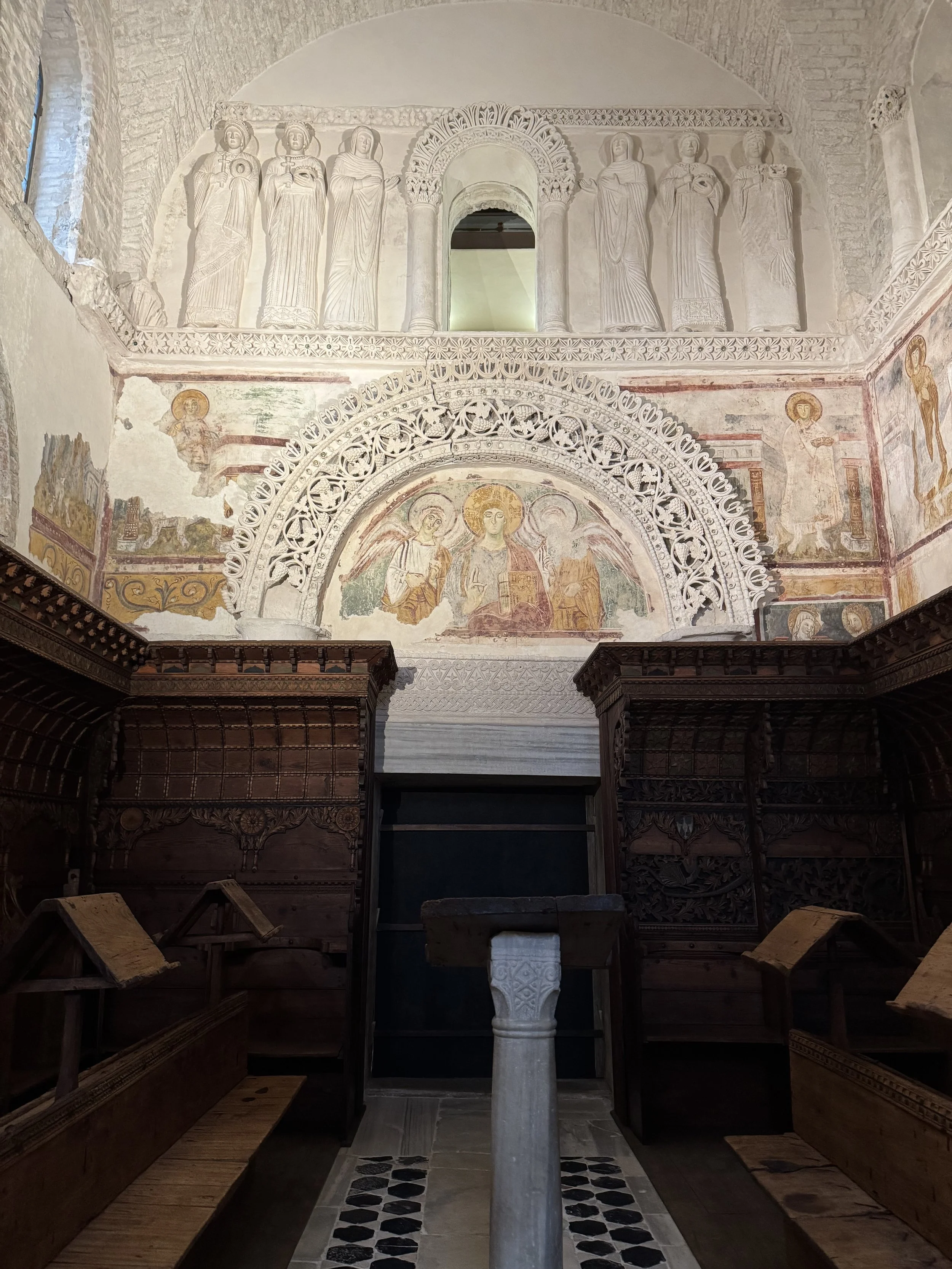 My visit to Cividale was just one afternoon in a light rain that quickly became a torrential downpour, so I was only able to get a taste of all that the village had to offer. The rain drove us mostly indoors to two museum complexes. The first was the Oratorio di Santa Maria in Valle. Once an 8th century convent, where the daughters of noble Longobards might have lived, it remained a place for nuns through the 1800’s and continued as a convent and girl’s boarding school right up to the year 1999. Today it is a museum with a small chapel and beautifully displayed frescos remnants.