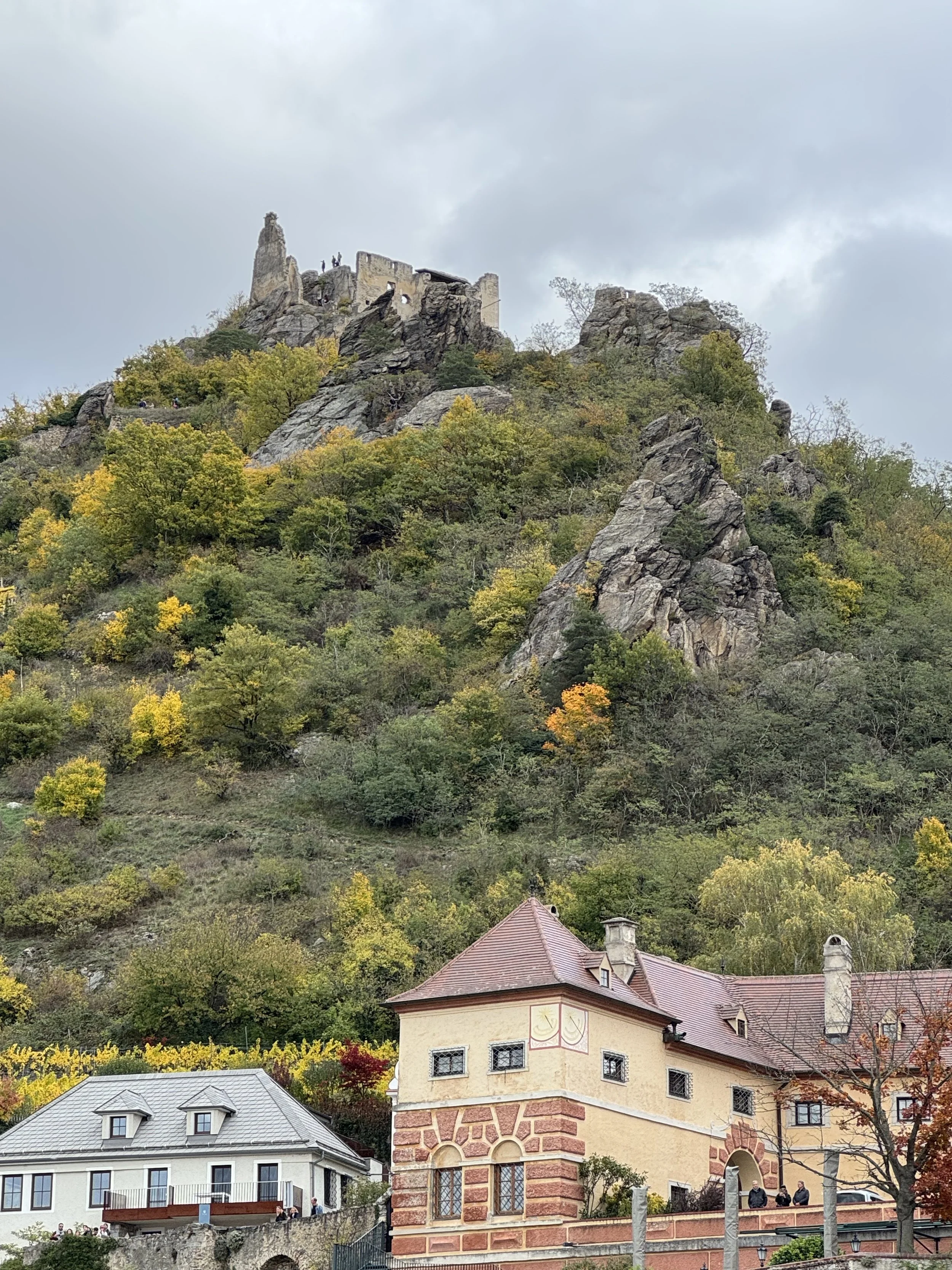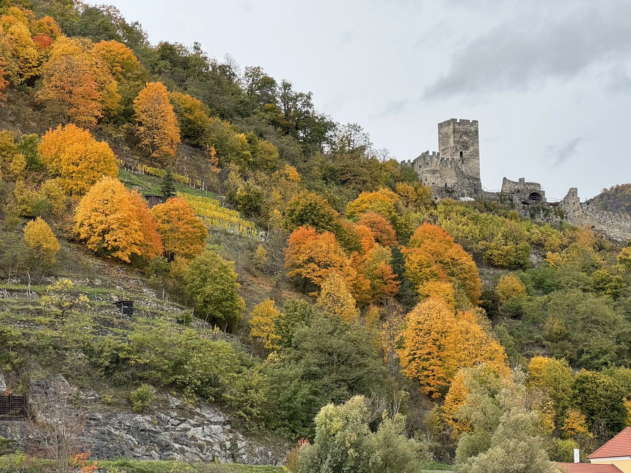 The Hinterhaus Castle ruins above the town of Spitz surrounded by glorious fall color