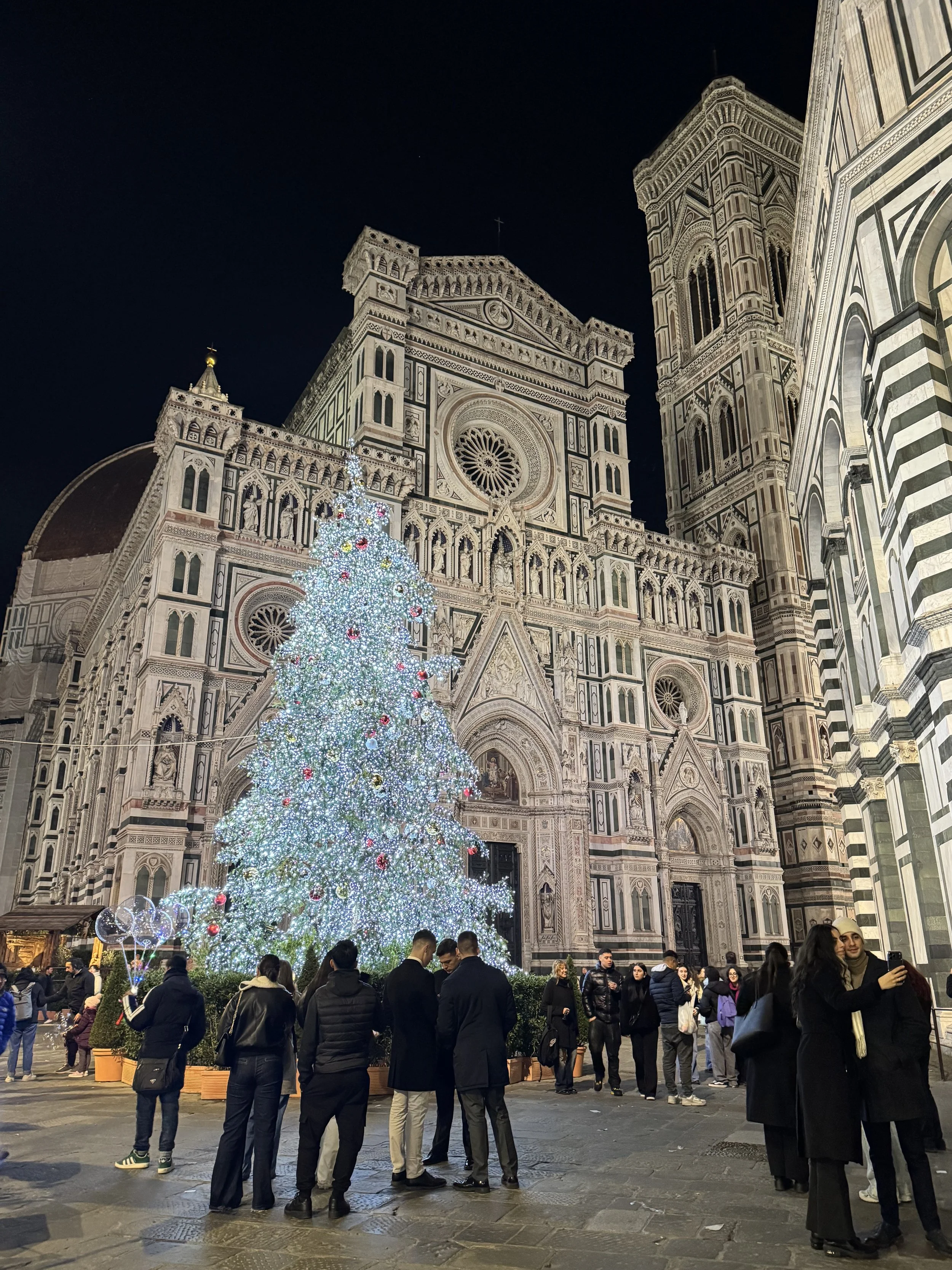 The Christmas tree in the piazza in front of Florence’s Duomo (officially the Cathedral di Santa Maria del Fiore). December 2025